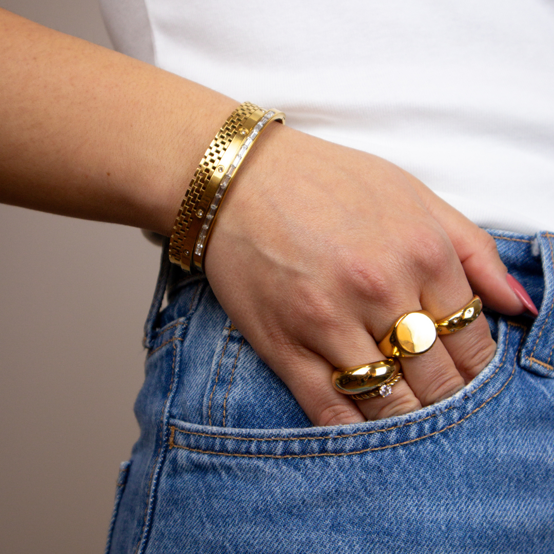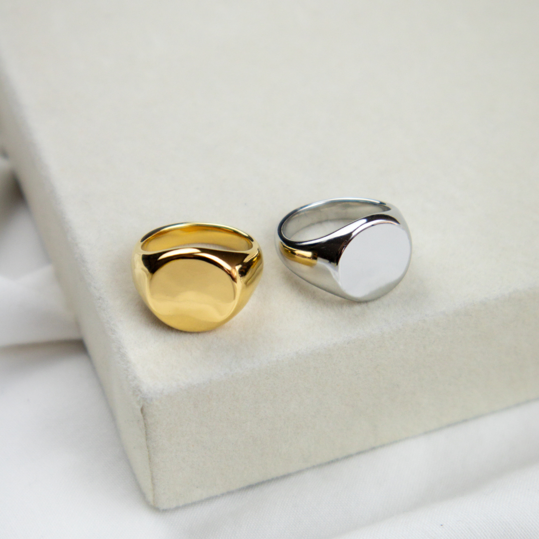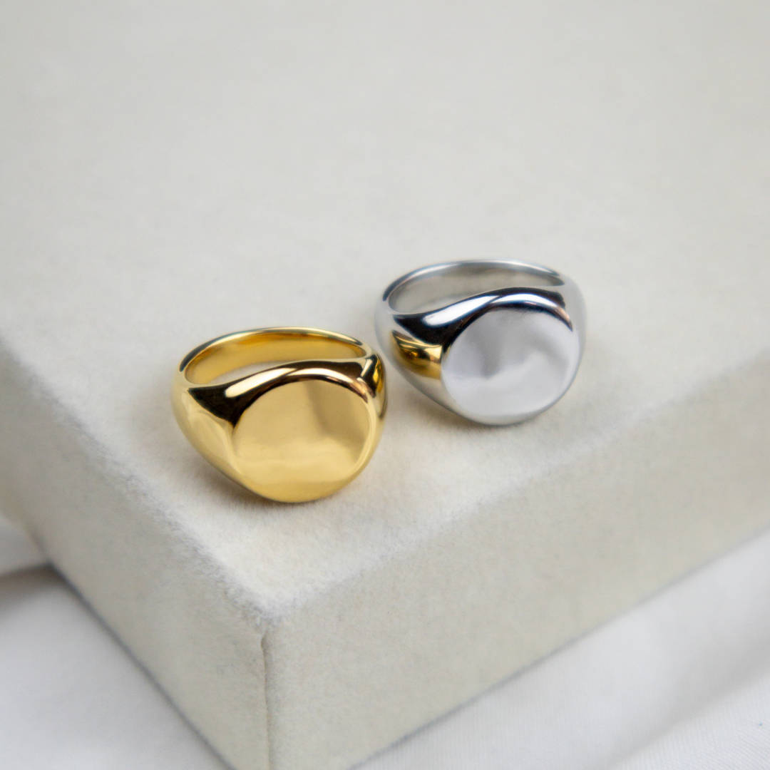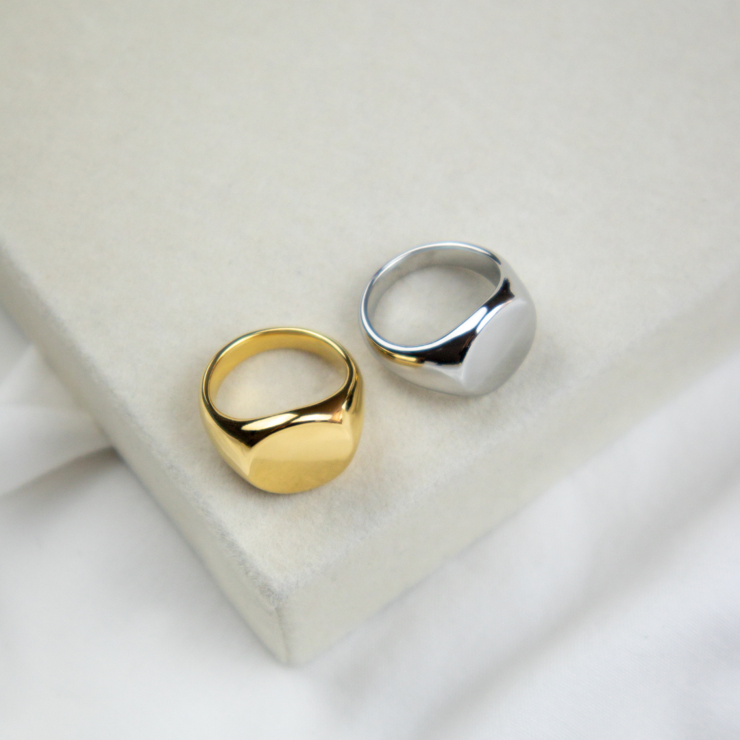 O anel Nory é uma afirmação subtil — com um design chunky e moderno, mas com uma frente lisa e arredondada, que lhe dá um toque de sofisticação discreta.