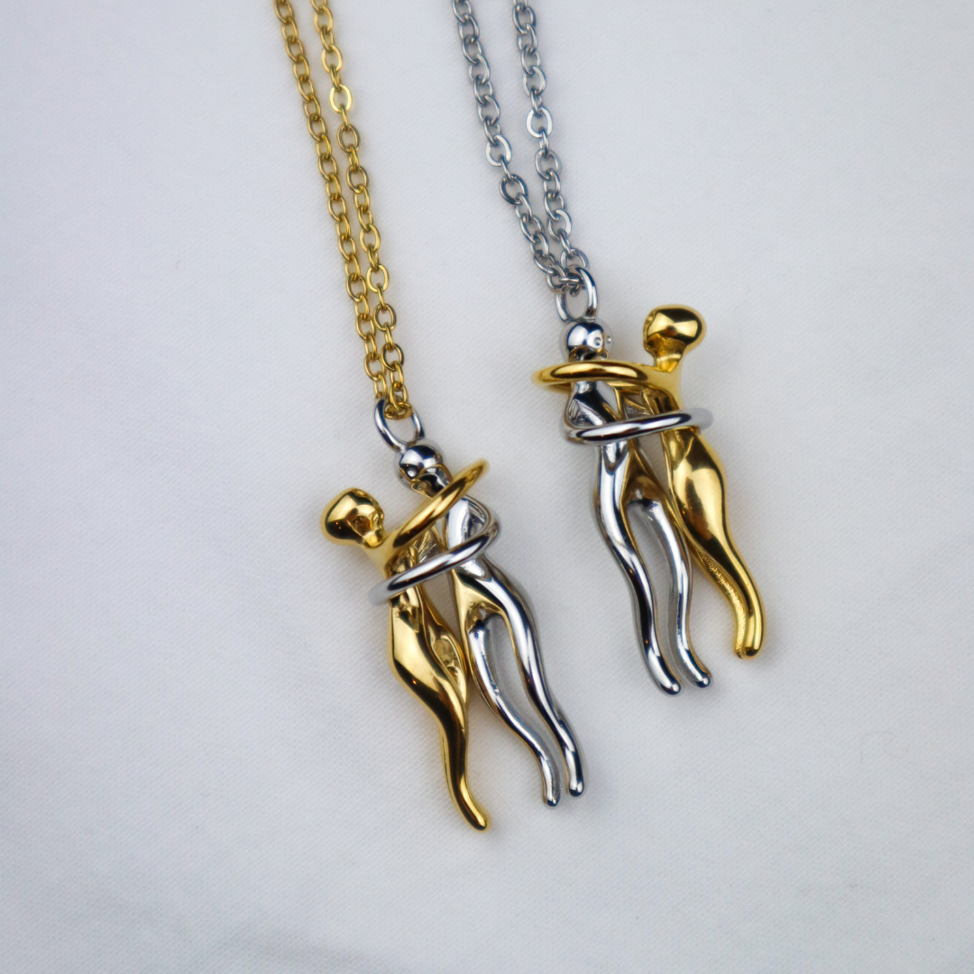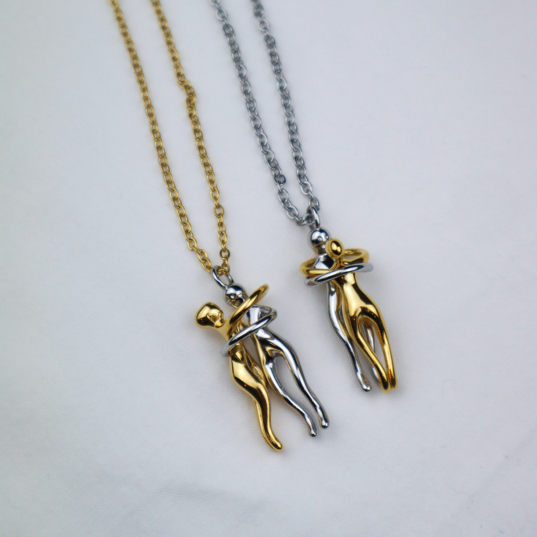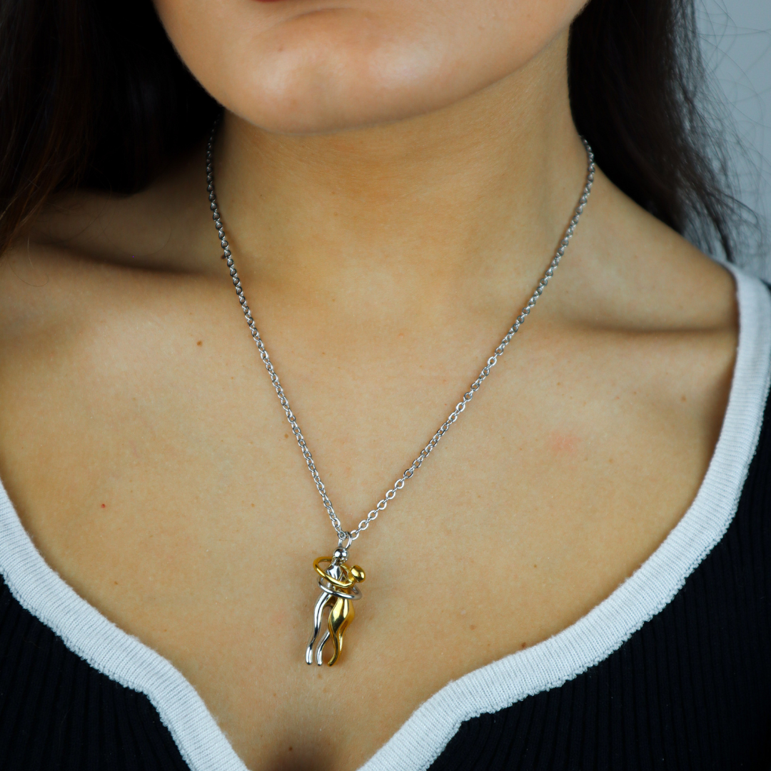colar Soulmate celebra a ligação especial entre duas almas. O seu pendente retrata duas figuras num abraço simbólico, uma dourada e outra prateada, representando amor, cumplicidade e proteção.