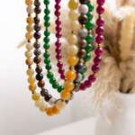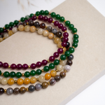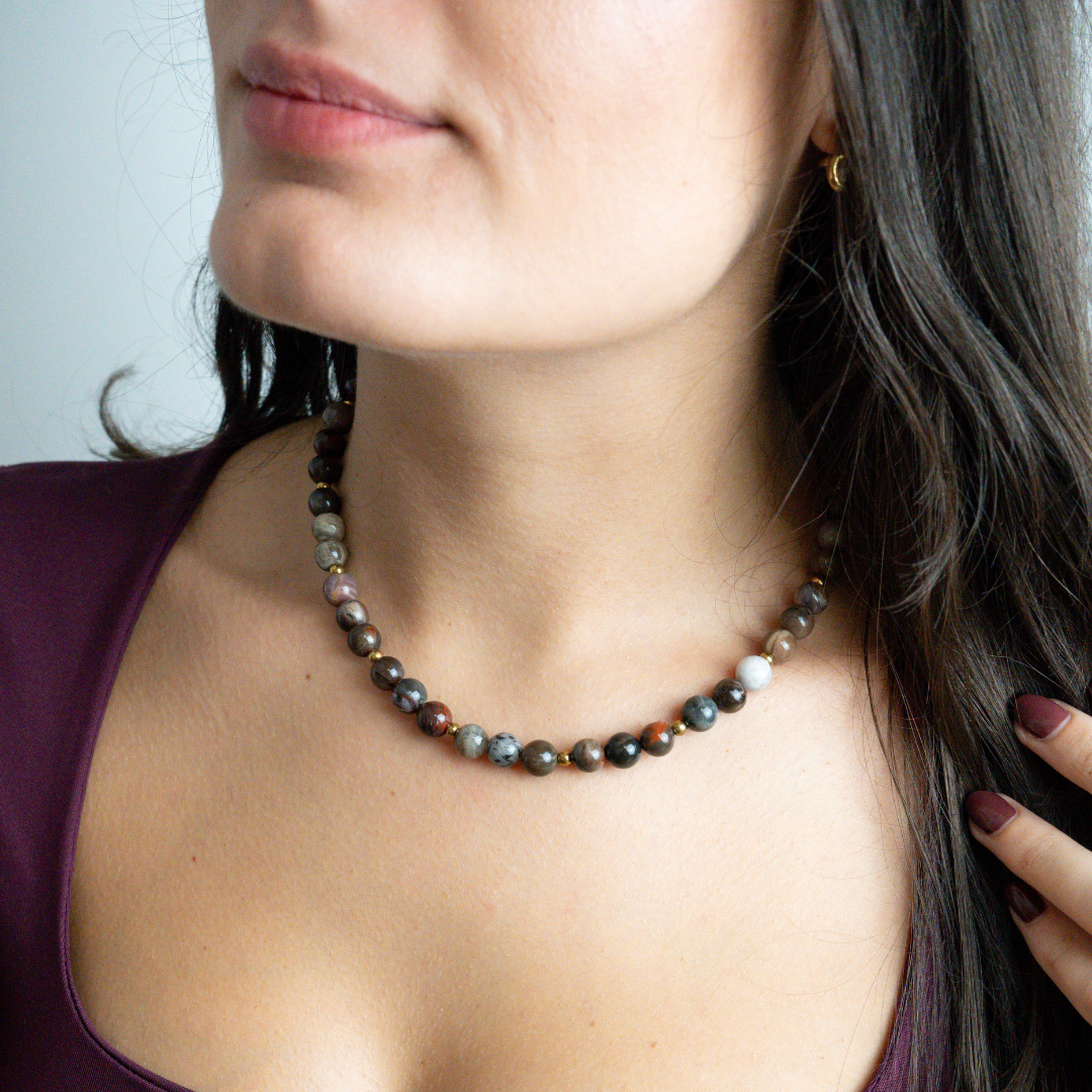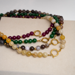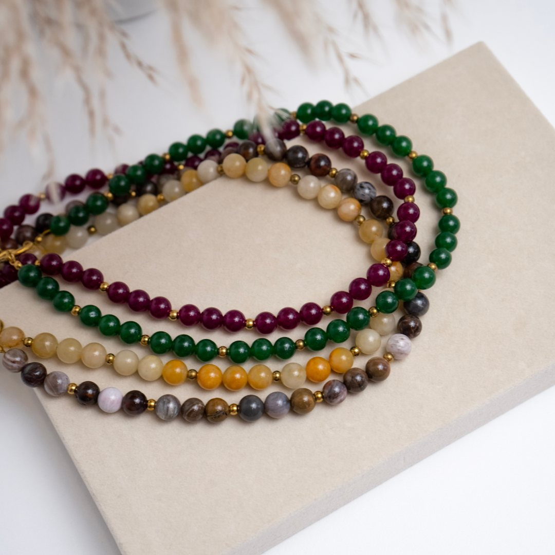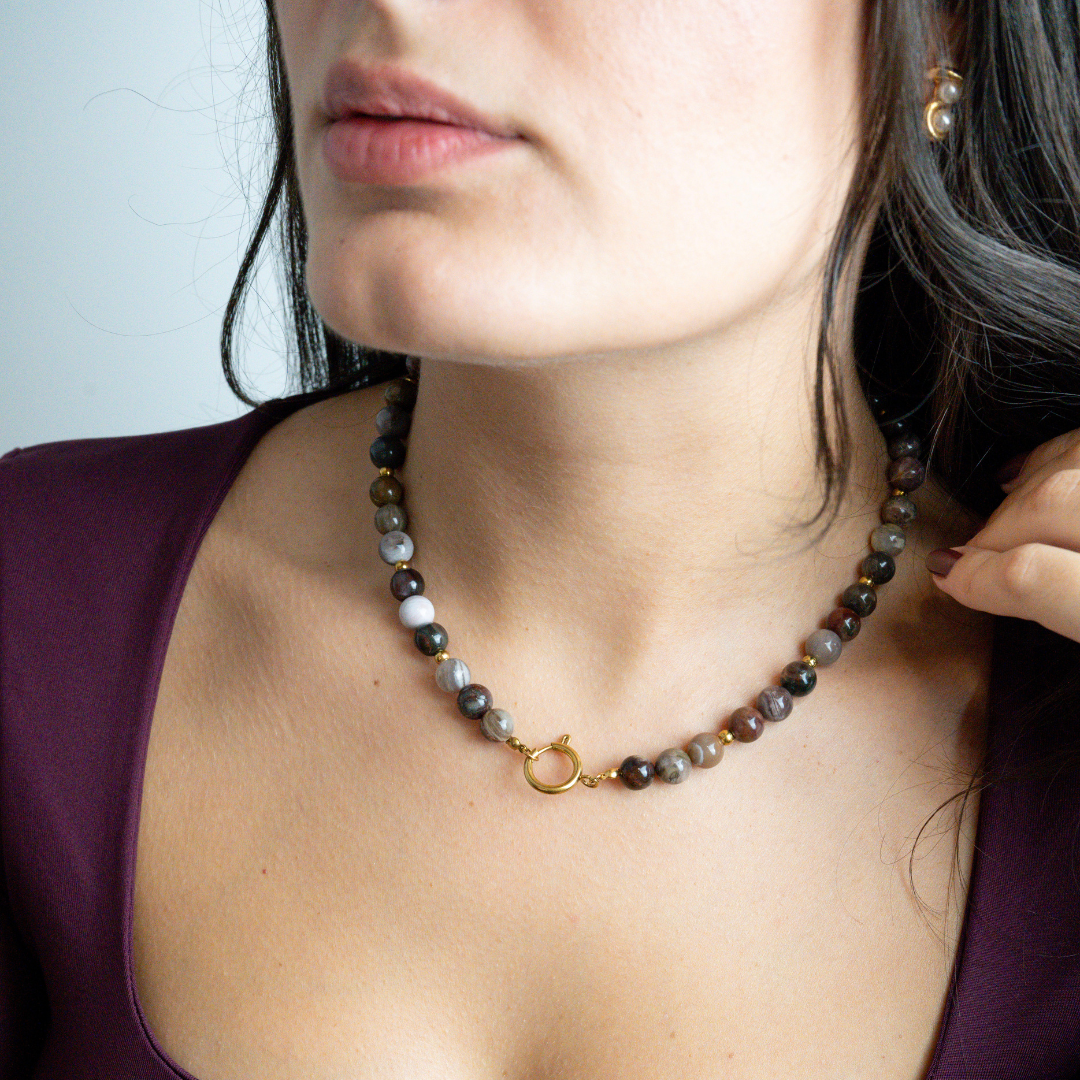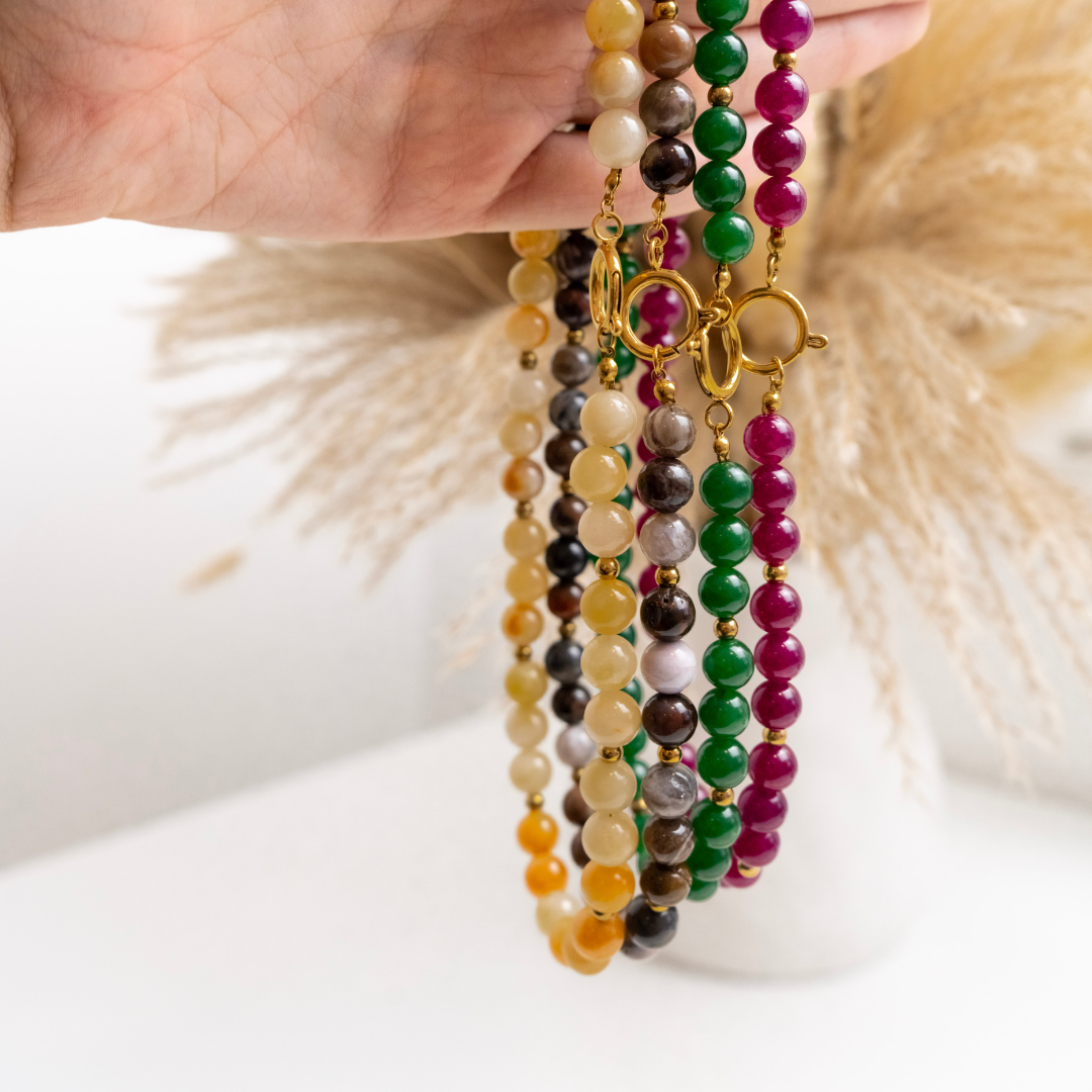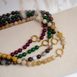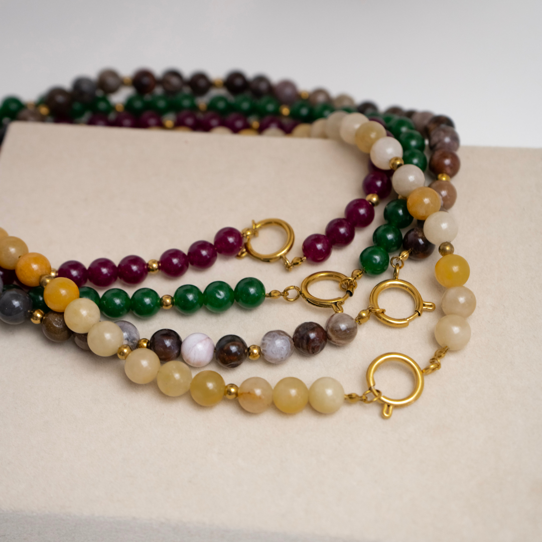 Autêntico, versátil e com o charme natural das pedras verdadeiras. O colar Jade combina esferas de pedras naturais com acabamentos em aço dourado, criando uma peça rica em textura, cor e significado. Uma escolha para quem valoriza a beleza orgânica e os detalhes bem feitos.