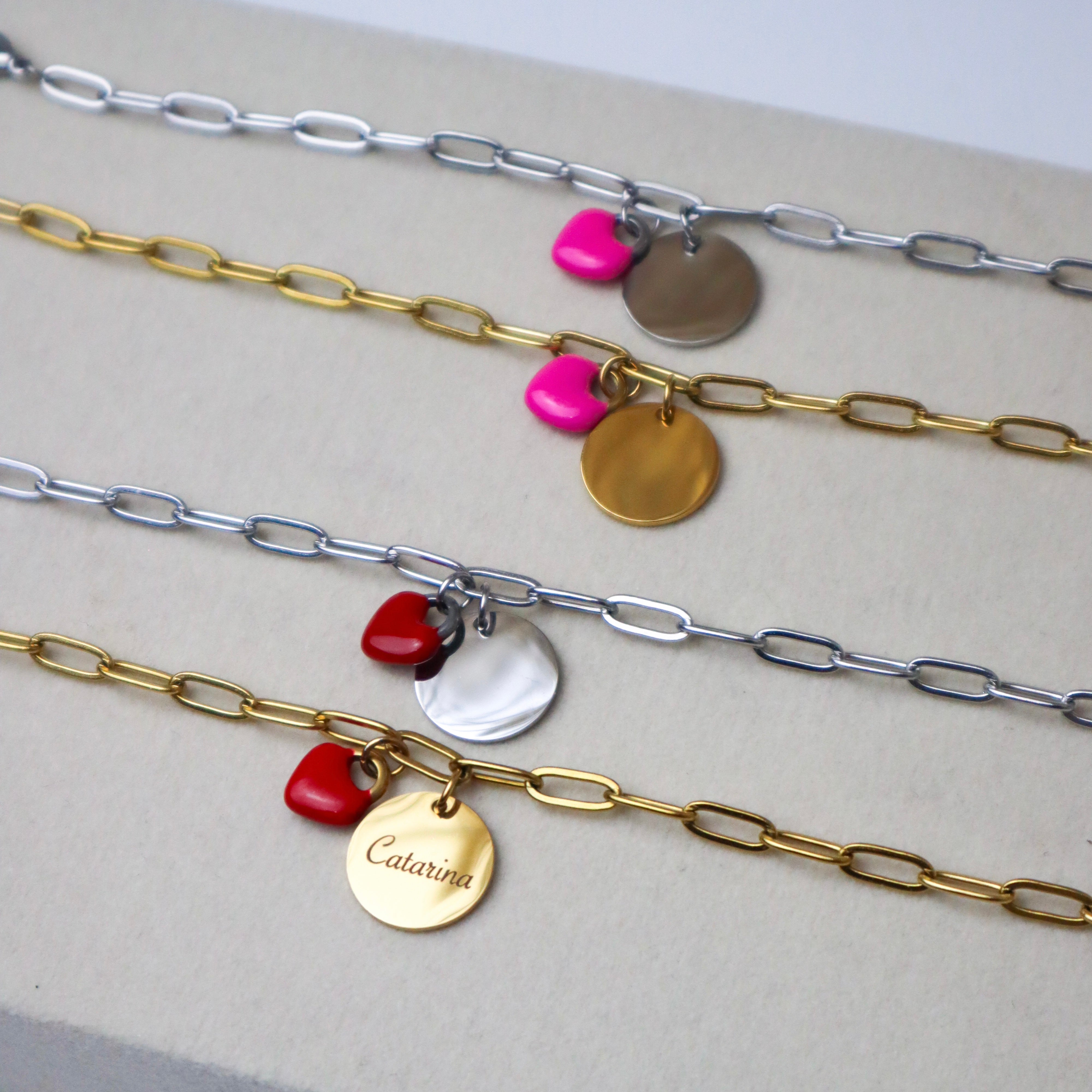 It stands out for its customizable touch: an elegant pendant that you can engrave with icons or text. With the option of including a charming red or pink heart, this bracelet becomes a unique declaration of affection or remembrance.