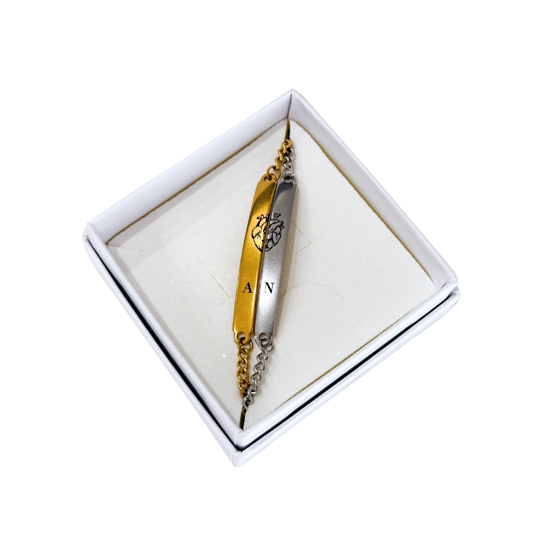The bracelets feature an engraved heart , which completes the look when the two are joined together—a subtle yet meaningful detail. Plus, you can personalize each one with initials or special numbers , making this set even more unique and personal.