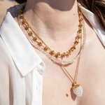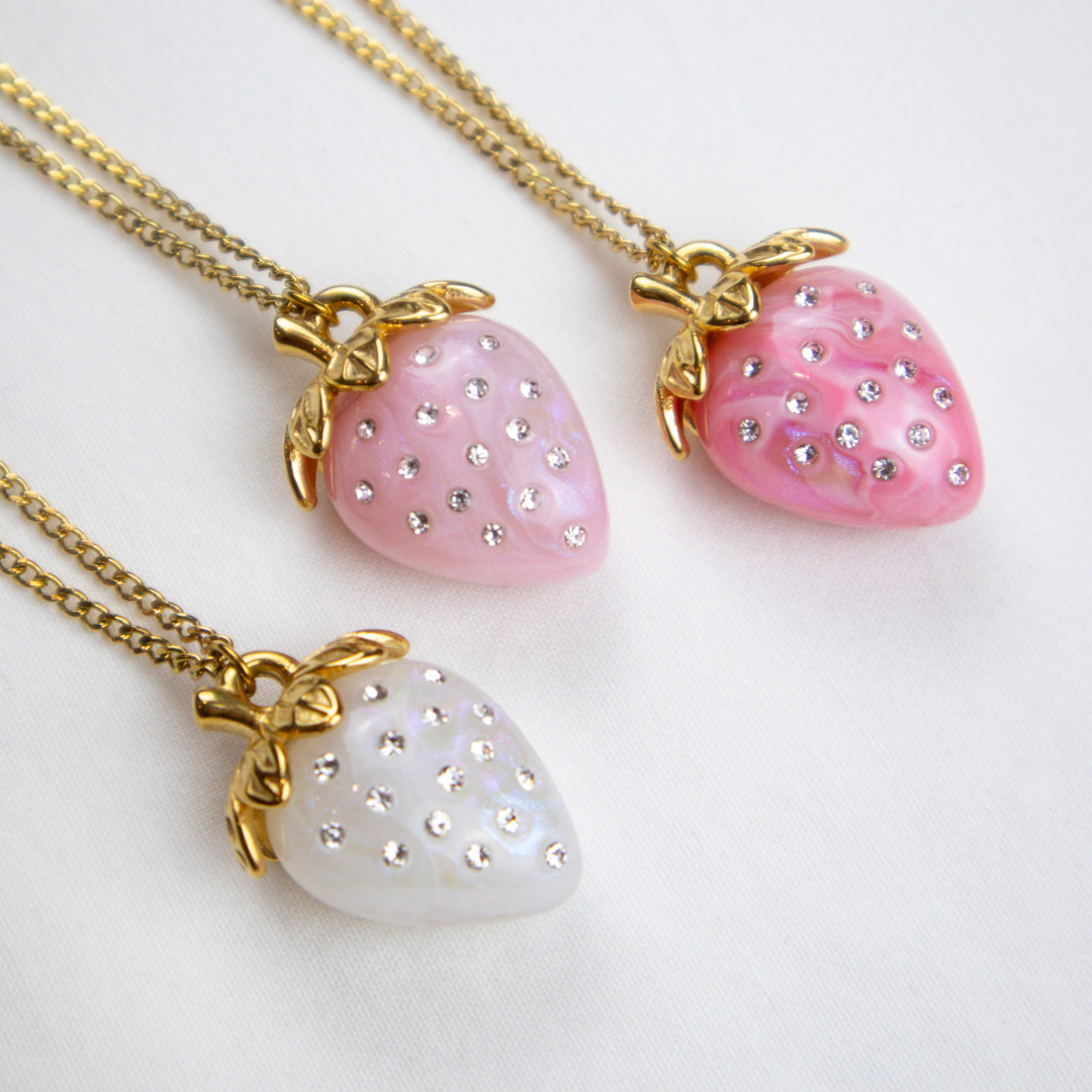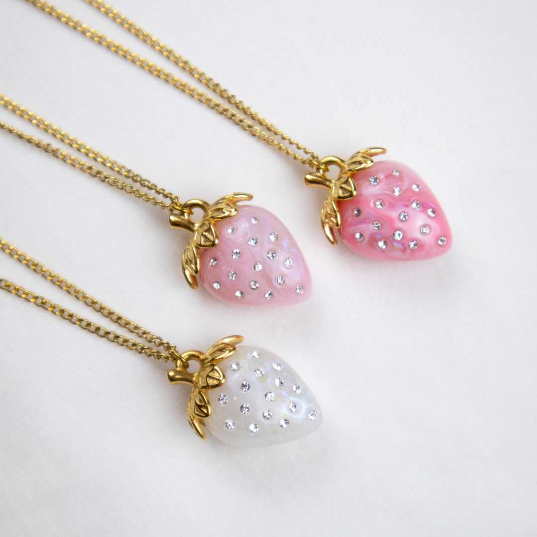 Delicate and irresistible like a freshly picked strawberry, the Berry Necklace features a strawberry-shaped pendant with cubic zirconia, available in three colors (light pink, dark pink, and white), perfect for adding a sweet and fun sparkle to your summer looks.