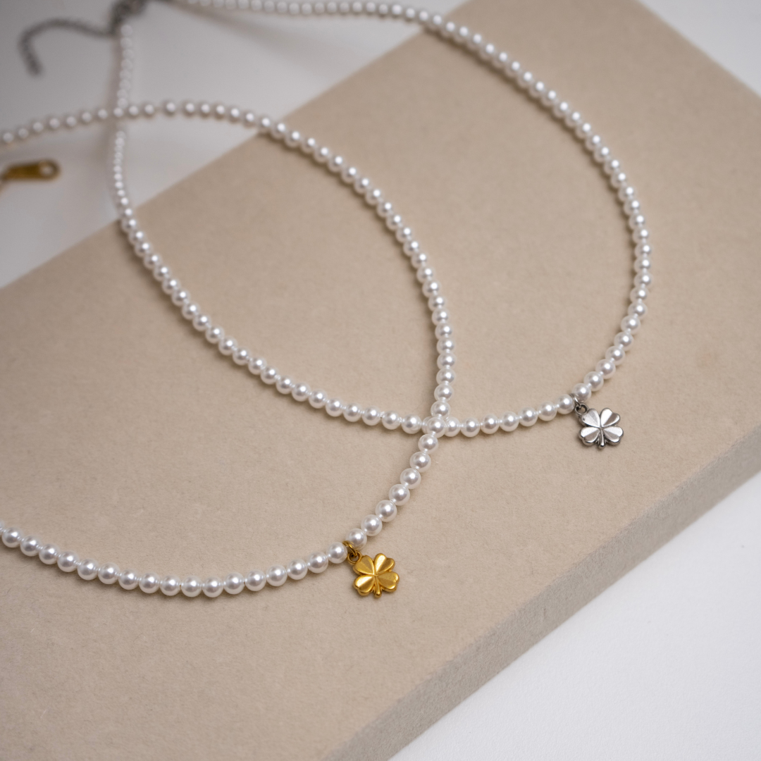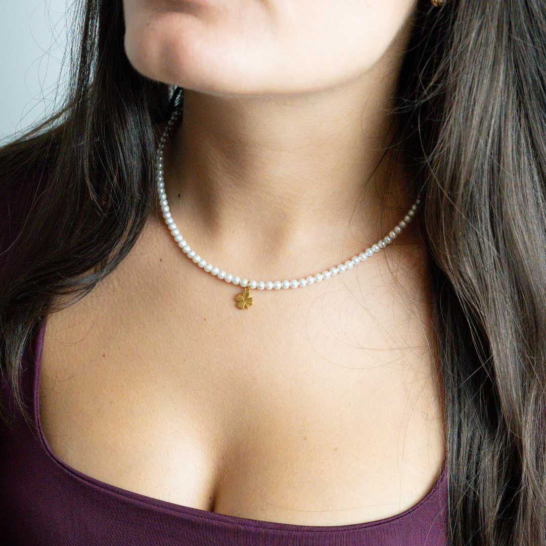 Com pérolas naturais pequenas e um pendente em forma de trevo, o Colar Clover é uma fusão de delicadeza e sorte. Uma peça leve e simbólica, pensada para acompanhar os teus dias com leveza e boas energias.