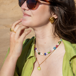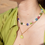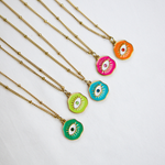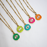 With a mystical and modern touch, the Hazel necklace celebrates intuition and protection with an eye pendant full of color and meaning. Available in five variations—dark green, light green, blue, pink, and orange—this necklace is a true talisman to carry with you every summer day.