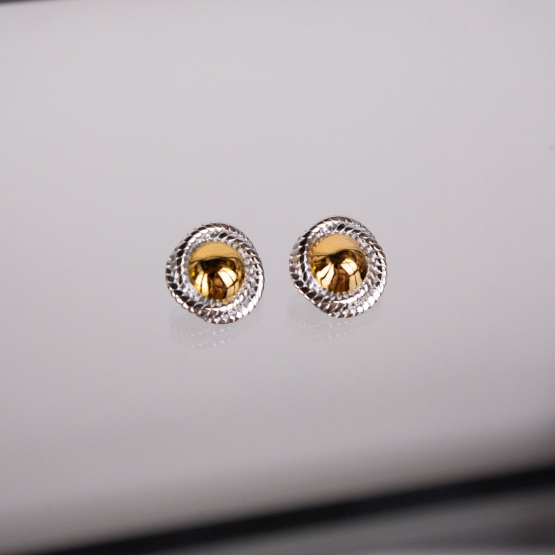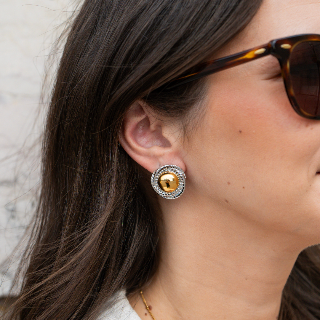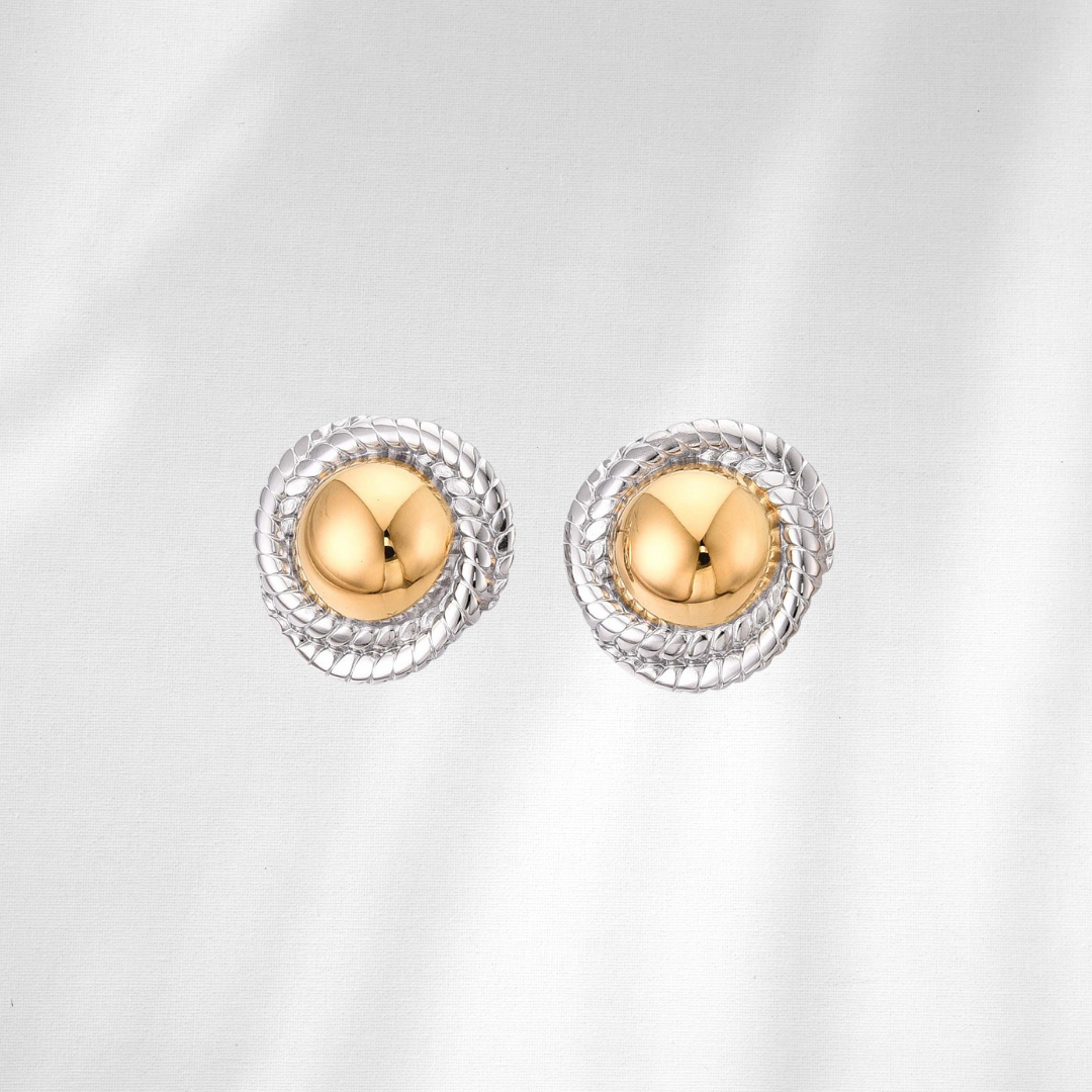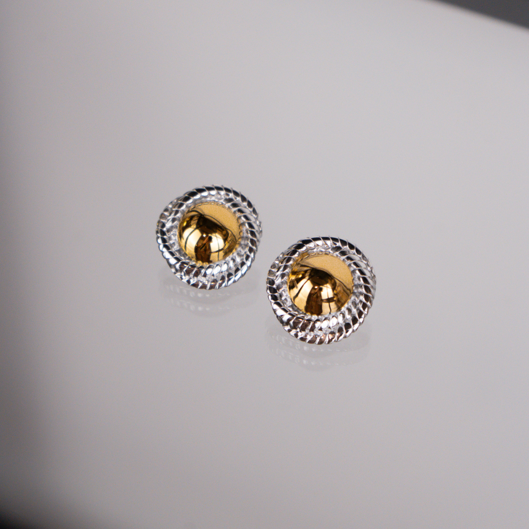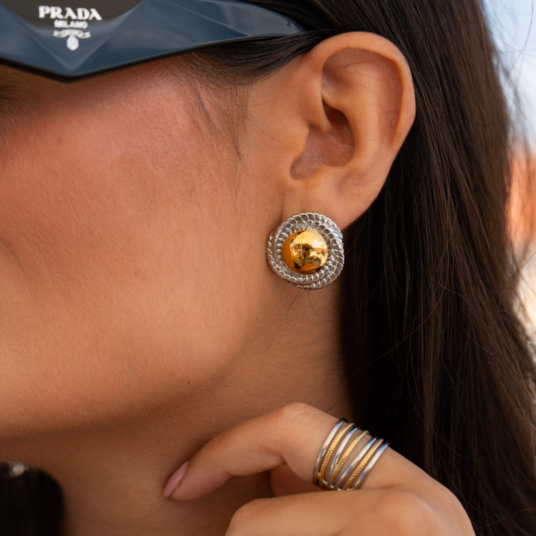 Com um design redondo icónico, os Brincos Luna combinam um centro polido dourado com aro prateado texturado. O efeito é luminoso e elegante, como a serenidade da lua refletida em metais contrastantes.