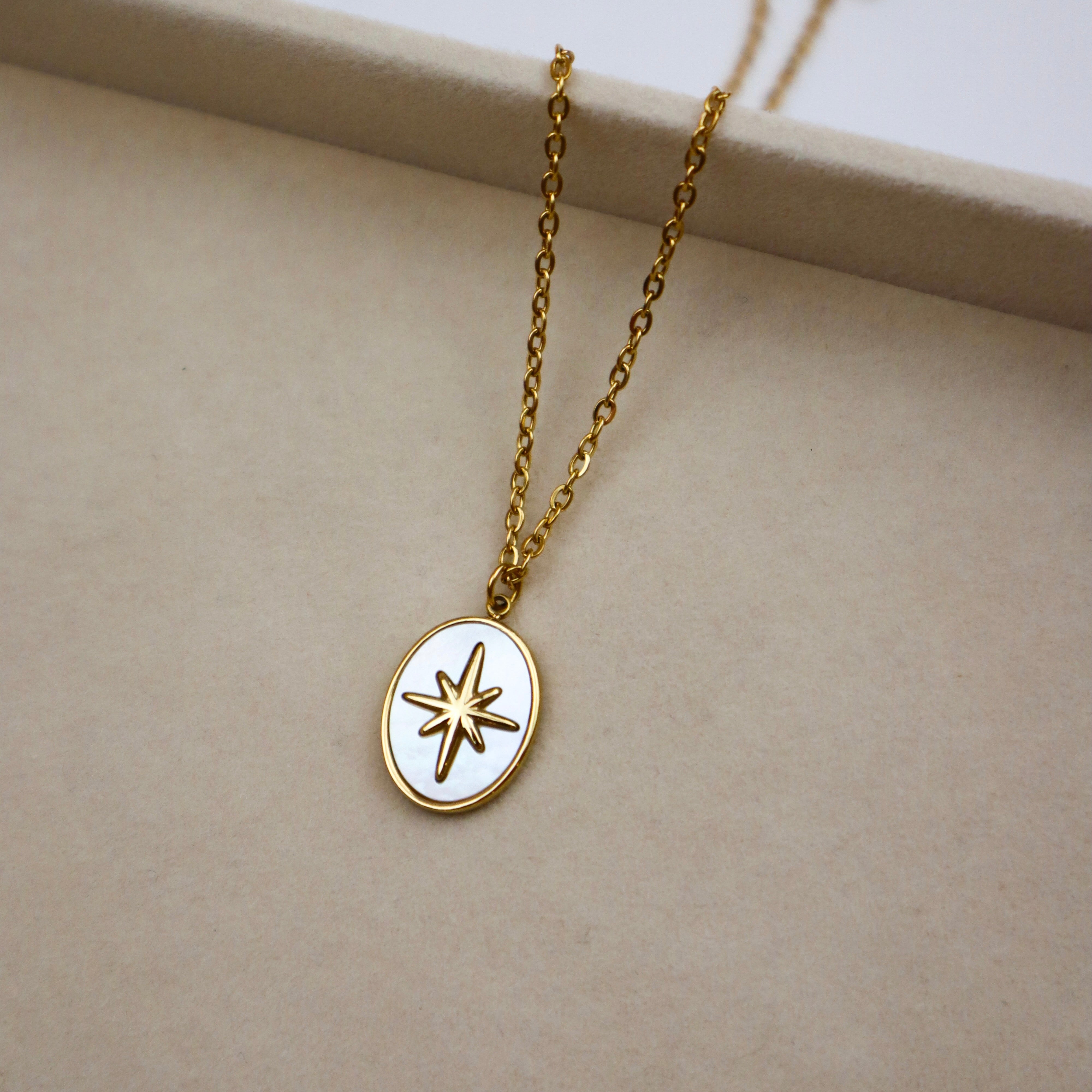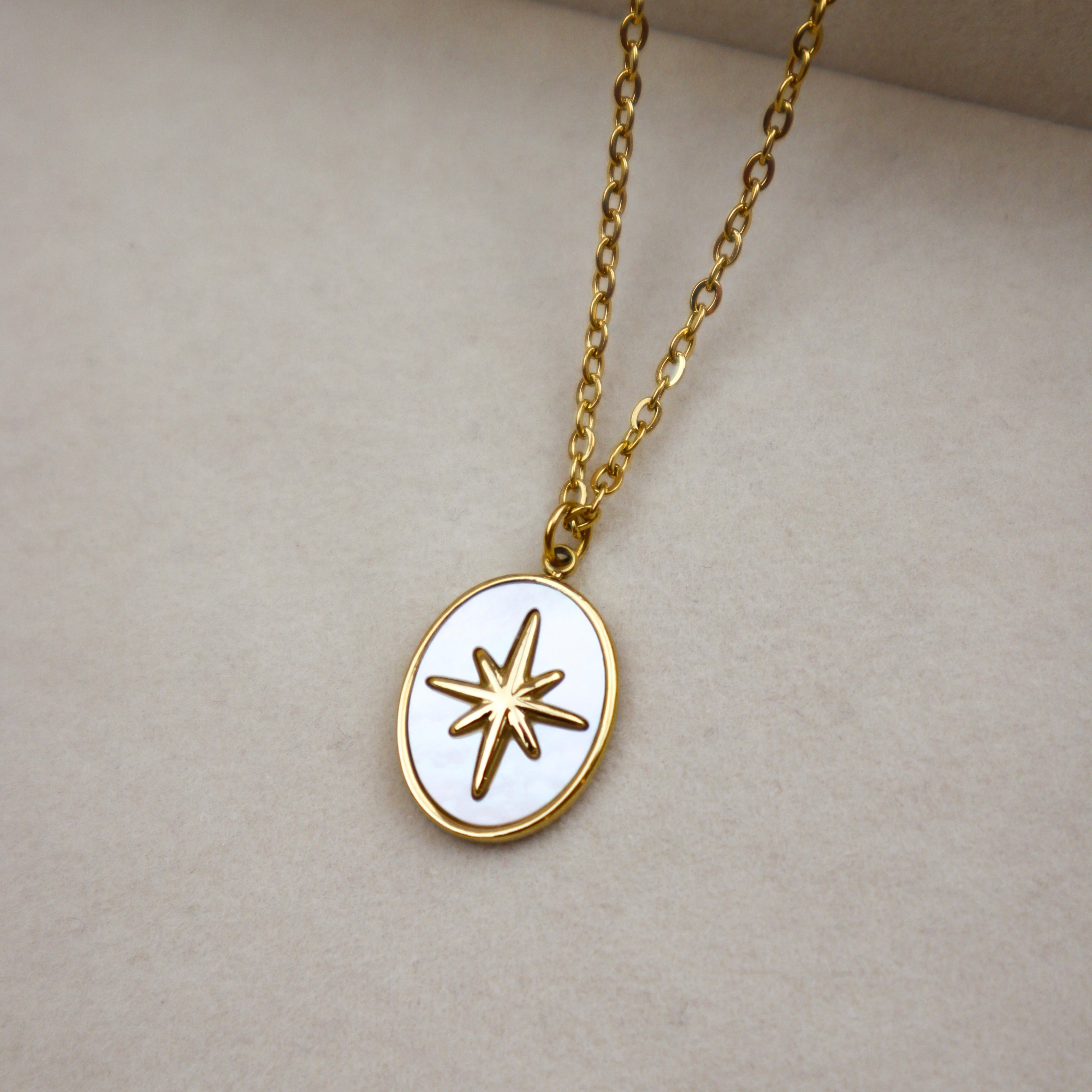 Cozy Autumn Collection | Colar de aço inoxidável com pendente oval de madrepérola com estrela.